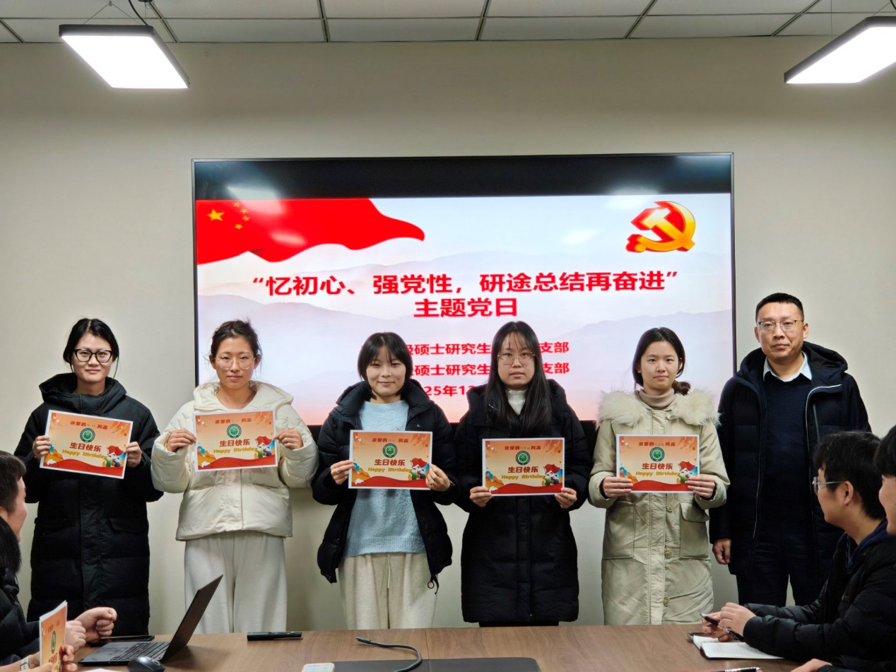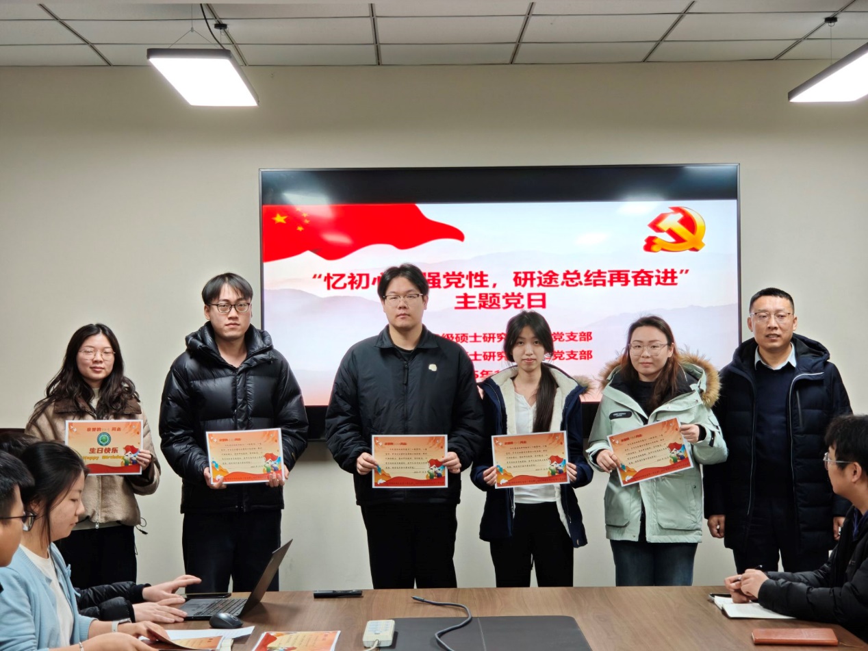 与会党员围绕个人的思想、学习、工作和生活情况,逐一分享了2025年度取得成绩和存在不足。会议为20名研究生党员赠送了“政治生日”贺卡。与会党员面向党旗,重温了入党誓词。