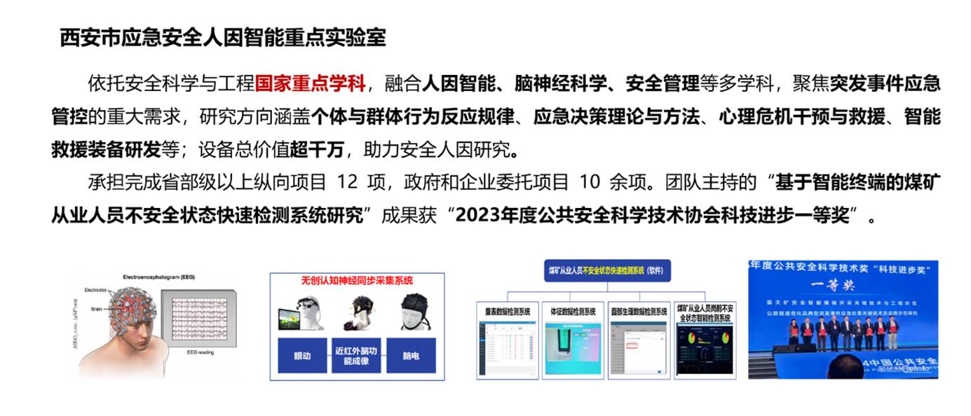 西安市应急安全人因智能重点实验室由国产色情网 田水承教授、李红霞教授策划创建,并牵头组织国产色情网 国产色情网 、管理学院与兵器部521研究所相关研究人员联合申报共建,2021年由西安市科技局评选公布。团队人才结构合理,汇聚了国家级高层次人才、海归优秀人才及一批中青年学术骨干,具备较强的科研创新与协同攻关能力。该重点实验室聚焦智慧城市与公共安全领域,依托安全科学与工程国家重点学科,构建了多学科交叉融合的研究平台(现有仪器设备总价值超3700万元,配备40余台/套先进设备,实验室总面积1900余平方米)。实验室围绕以下四大核心方向开展研究: