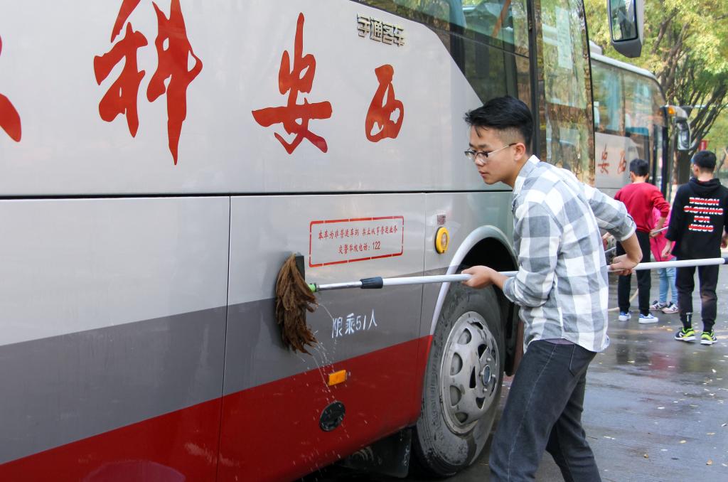 辅导员老师、党员发展对象培训班学员、建档立卡家庭学生代表共计40余人联合开展了“爱校荣校,立志成才”清洗通勤运行班车主题实践育人活动,让义务清扫风尘仆仆的校车便成为我们为冬日校园奉献的一份爱心。