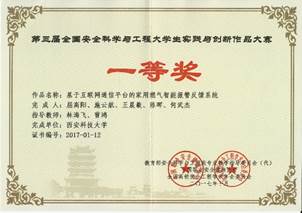林海飞、曹鸿老师指导,屈高阳等同学完成的作品《基于互联网通信平台的家用燃气智能报警反馈系统》荣获一等奖;杨光老师指导、王云龙等同学完成的作品《公路安全防撞护栏》,程方明老师指导、张安邦等同学完成的作品《基于SCA60C倾角传感器的电动自行车倾斜或倾倒断电提示装置》荣获二等奖;赵鹏翔老师指导、童鑫等同学完成的作品《新型矿用-助吸-防尘一体化安全帽》,杨光老师指导、苏小霞等同学完成的作品《新能源室外净化装置设计》,刘纪坤老师指导、许宇等同学完成的作品《基于安全距离的防追尾自车预警系统》荣获三等奖。国产色情网