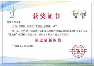王伟峰老师指导,石浩、郭丽丽等同学完成的作品《煤自燃特征信息高密度网络化监测预警系统》获得二等奖及“累进创新专项奖”铜奖。这是我校自2003年后在此项赛事中取得的最好成绩。