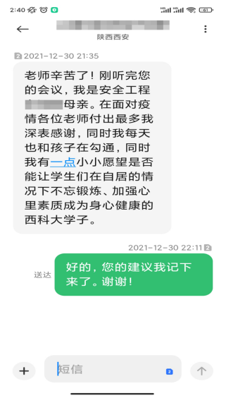 家校联动,共筑防疫屏障。学工干部通过腾讯会议等线上方式先后组织召开“云端”家长会。截止目前,除本科2018级因辅导员王倩老师临时接到紧急任务推迟会议外,本科其他年级实现全覆盖。家长们纷纷表示,疫情防控家校联动线上会议召开的很及时、很必要,对学校、学院的疫情防控举措表示认可和支支持,对学生在疫情期间因宿舍封闭管理导致的一些暂时不便表示理解,愿意鼓励学生参与学校的疫情防控志愿服务工作。部分家长表示愿意捐赠防疫物资支持学院疫情防控工作。