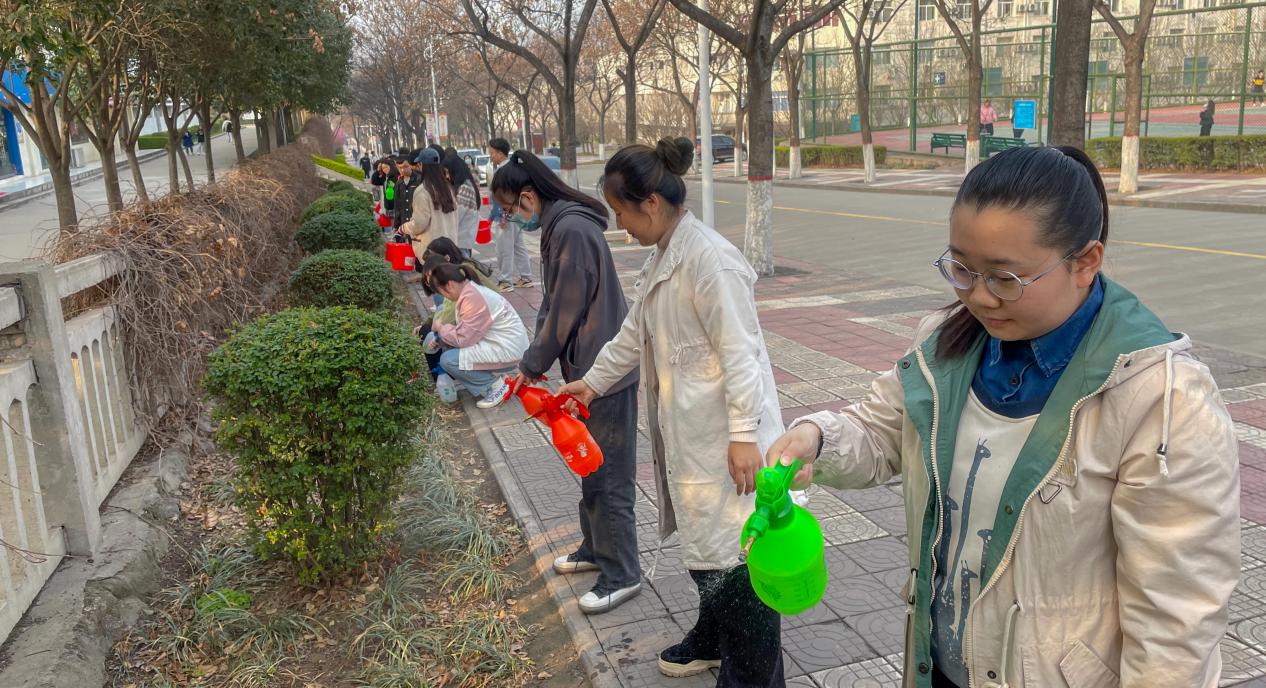 在支部书记的带领下,党员同志们迅速投入到热火朝天的劳动之中,按照划定好的区域进行浇水、捡拾枯枝、清理垃圾,大家忙而不乱,干劲十足,展现了新时代青年的劳动风貌,用实际行动改善校园环境,建设更美好的生活家园。