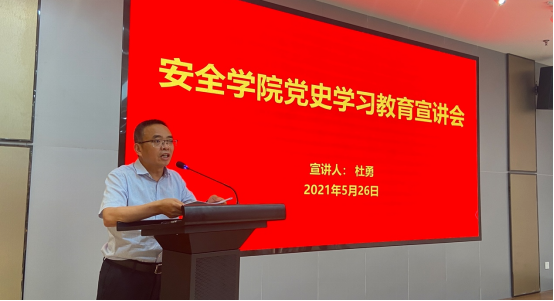 杜勇指出,学院全体教职工要始终把握正确导向,树立正确历史观,准确把握党史、新中国史、改革开放史、社会主义发展史的主题主线、主流本质,旗帜鲜明反对历史虚无主义。要从党史学习教育中汲取精神力量,转化为源源不断的奋进动力,真正做到学史明理、学史增信、学史崇德、学史力行,将改进课堂教学、提高教学质量作为一件实事抓紧抓好,为建设一流安全学科、一流专业、培育一流学生而不懈努力,以优异成绩庆祝中国共产党成立100周年。