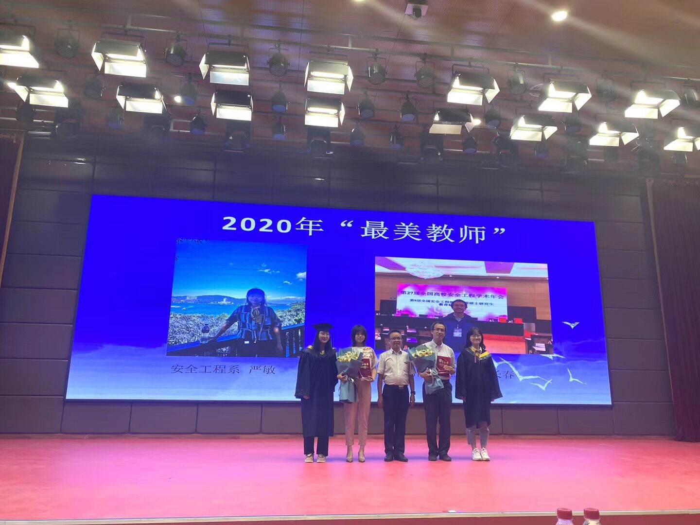 关于表彰2020年“最美教师”的决定》,学院党委书记杜勇为学院优秀本科毕业生、最美教师颁奖,学生代表向最美教师献花表示感谢。