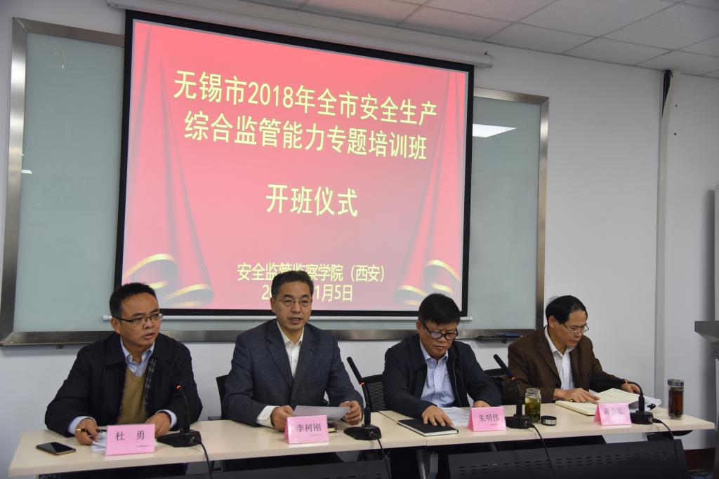 副校长李树刚,无锡市安委办副主任、安监局副局长朱明伟、安监局副调研员蒋会忠及来自无锡市安委会所属43家成员单位的56名学员参加了开班式。开班式由安全监管监察学院(西安)党委书记杜勇主持。
