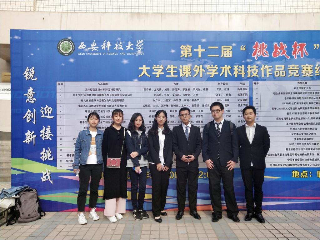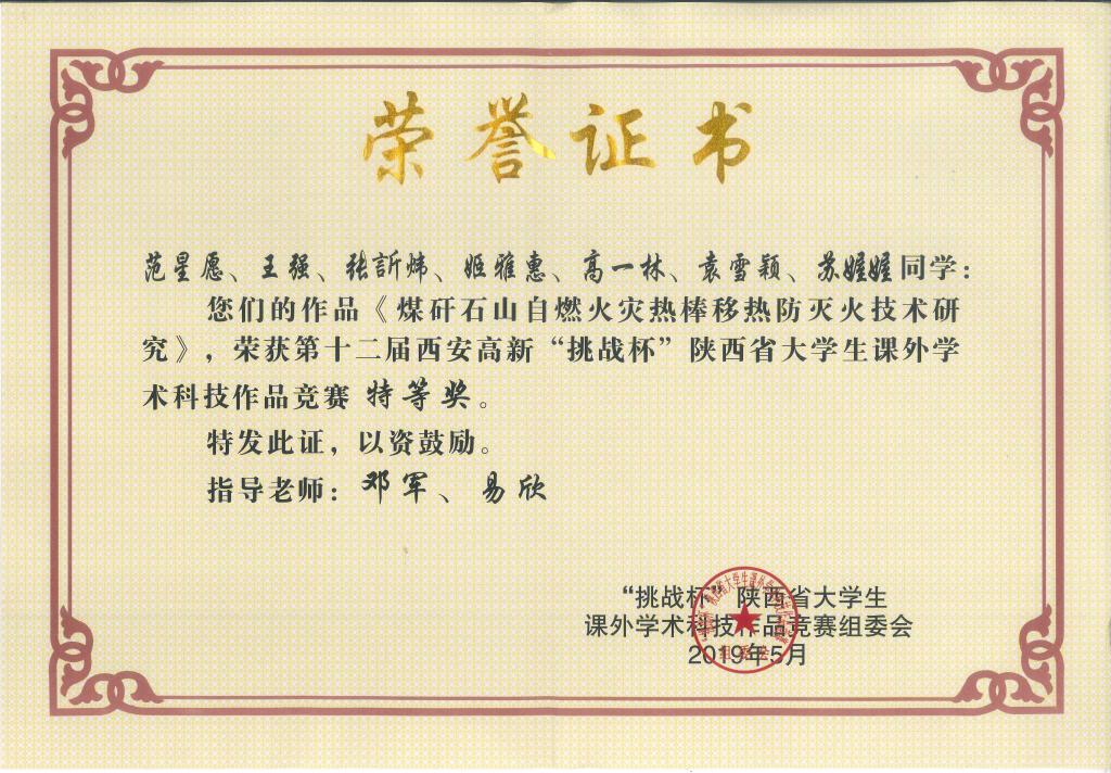 5月28日,由共青团陕西省委、中共陕西省委教育工委、陕西省科学技术协会、陕西省科技厅、陕西省社会科学院、陕西省学生联合会、西安高新区管委会共同主办,西北工业大学承办的第十二届西安高新“挑战杯”陕西省大学生课外学术科技作品竞赛终审决赛在西北工业大学长安校区落下帷幕。我院邓军、易欣老师指导,范星愿等7名同学完成的作品《煤矸石山自燃火灾热棒移热防灭火技术研究》荣获特等奖;肖旸、易欣老师指导,白广余等5名同学完成的作品《煤火热能提取与温差发电转化基础研究》荣获二等奖。