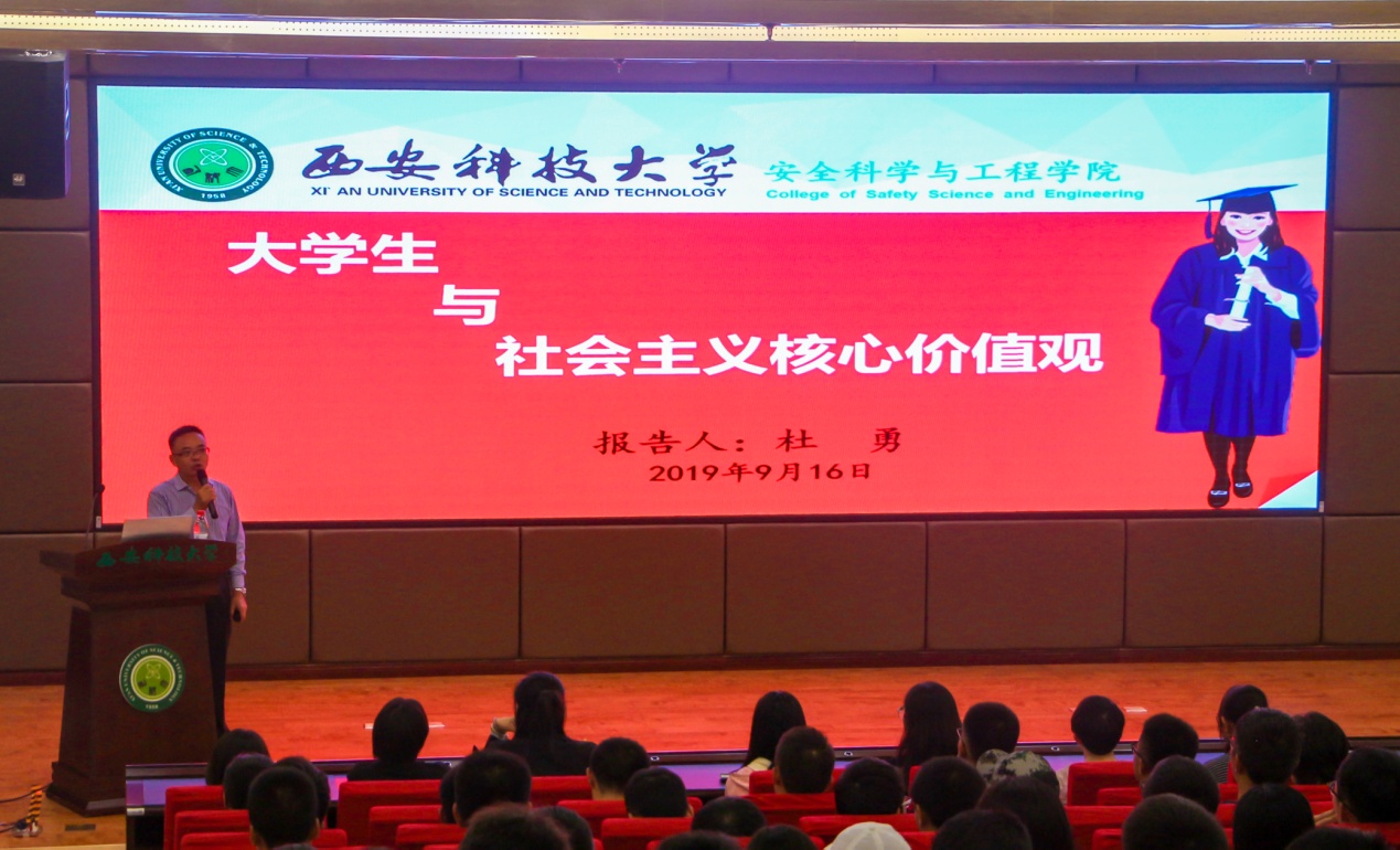 9月4日上午,在雁塔校区教学主楼401阶梯教室,杜勇给2019级全体研究生做了题为“研究生与社会主义核心价值观”的主题报告;9月18日晚上,在临潼校区煤炭科技中心二楼报告厅给2019级全体本科生做了题为“大学生与社会主义核心价值观”的主题报告。他以习近平总书记关于青年工作的重要讲话为引领,根据新入校研究生、本科生的不同特点,从“爱国爱校爱学院、社会主义核心价值体系的建立、诚信是立身之本”等三个方面,要求全体新生牢记按总书记的谆谆教导和殷切期望,将“人生的扣子从一开始就要扣好”。他为同学们介绍了学校和国产色情网