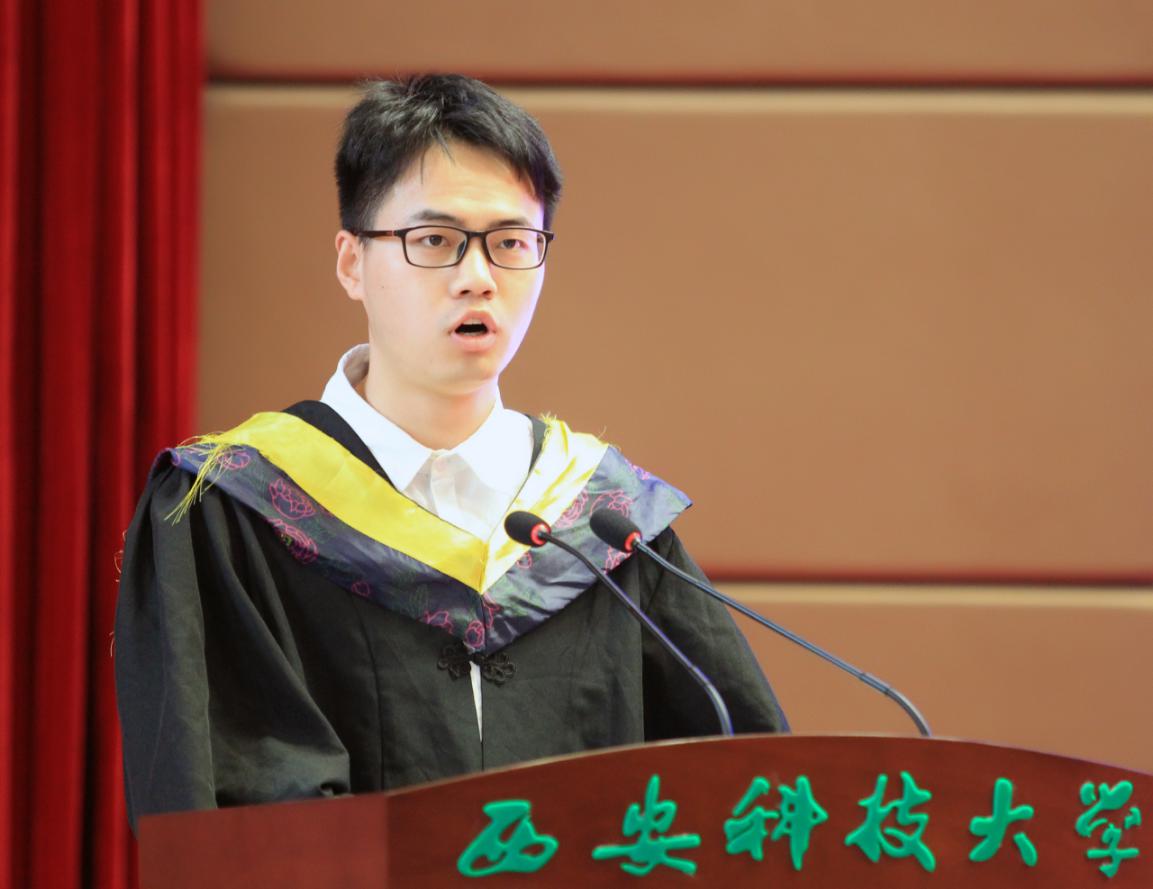 毕业典礼在雄壮的国歌中正式开始,2020届毕业生代表郭政达、毕业班辅导员同超进行了发言。