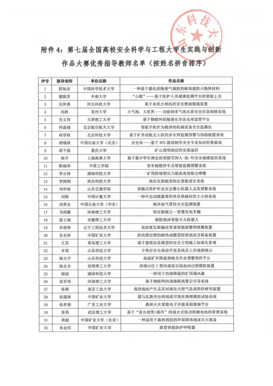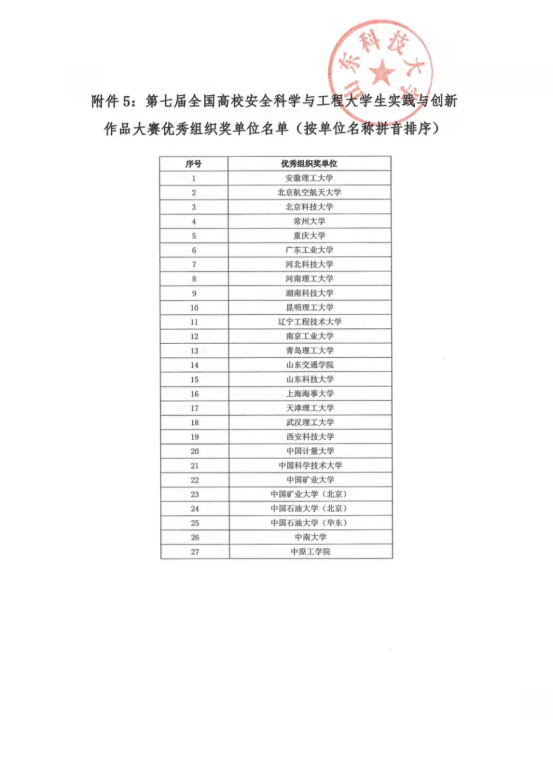 全国高校安全科学与工程大学生实践与创新作品大赛是安全科学与工程相关专业的全国性赛事,旨在引导、支持、激励大学生开展科技创新活动,培养学生的创新精神、探索意识和实践能力。大赛为我国安全科学与工程类专业大学生的工程实践能力、创新能力及团队合作精神的培养和锻炼搭建了很好的平台,也为高校教师、同行进行学生实践能力、创新能力培养经验交流提供了难得的机会。