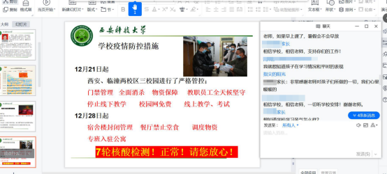 点面结合,制定宣讲提纲。学院学工办主任、团委书记、2021级辅导员郭胜忠牵头组稿,各年级辅导员共同参与,学院党委研究审议通过了线上会议宣讲提纲。提纲从西安疫情发展情况,学校、学院疫情防控举措,疫情下学生的成长,家校联动的契合点等四个方面进行了“面”上的共性阐述,各年级结合年级特点对就业、考研、新生适应等问题进行了“点”上的具体分析。