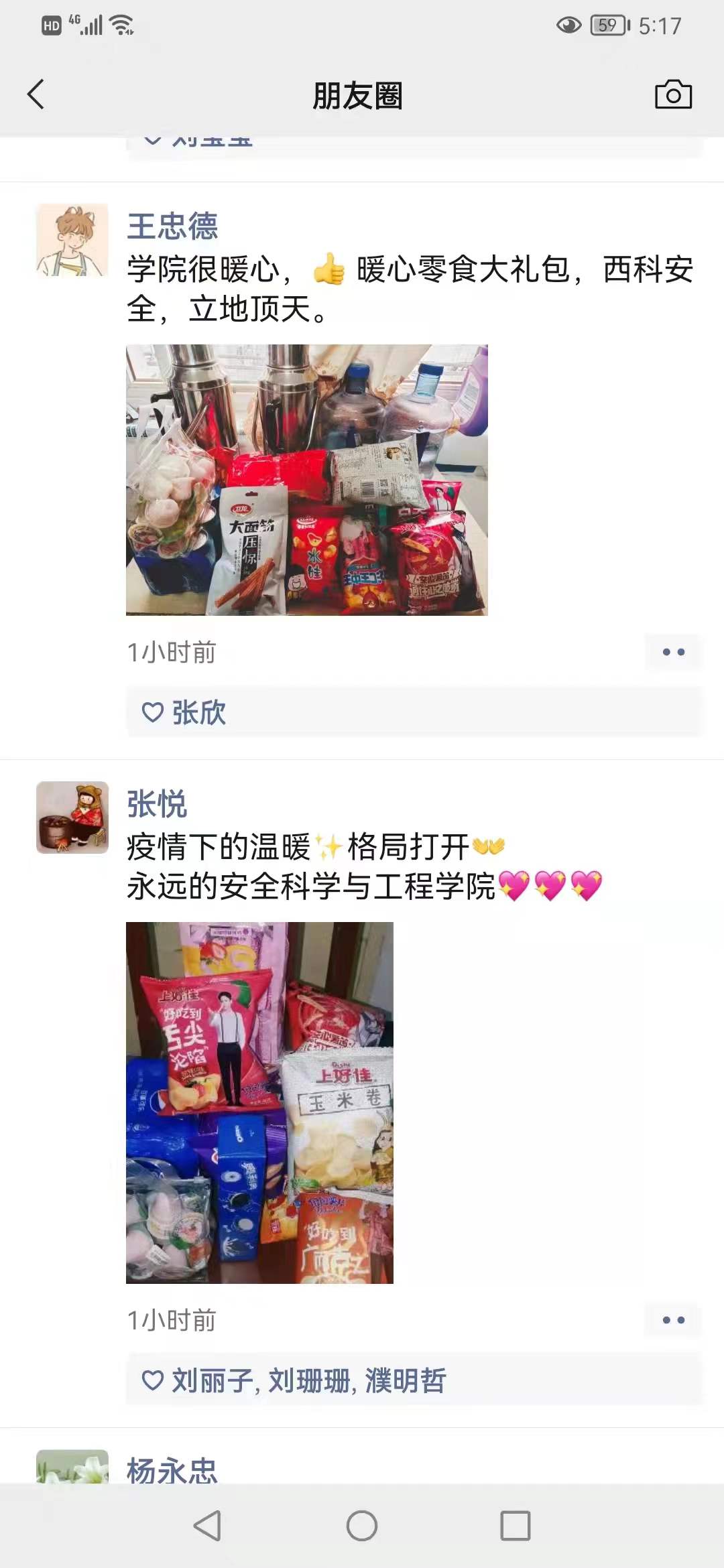 同学们在收到“爱心零食大礼包”后深受感动,在他们的微信朋友圈中纷纷晒出大礼包的照片,感谢学长学姐们的暖暖爱意,对学长学姐们心系母校、不忘师恩、关爱学弟学妹们的学子情怀表示敬佩。纷纷表示,一定不负学长学姐们的期望,遵守疫情防控规定,为今后能更好的报效祖国、服务国家安全生产和应急管理事业而努力学习。