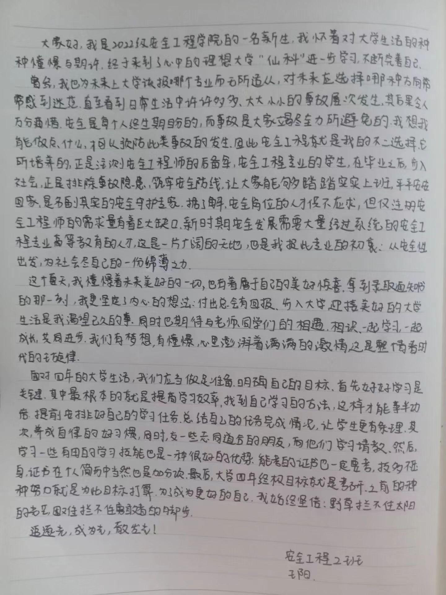 十八岁少年的眼中总是燃烧着青春的炽热火焰,心中怀揣着对未来的无限期待。曾无数次幻想过散步在日落的操场;和舍友们在宿舍谈天说地;在图书馆里手不释卷......我始终坚信“靠努力获得的才属于自己”哪怕是脱离父母羽翼的庇护,突破舒适圈的束缚选择“远走他乡”,在新的环境中创造一个更新更好更优秀自己。也正是这样坚定的想法让我选择了消防工程,或许不少人不理解这个做法,可是安全是万事的核心与基础,如果没有人愿意去接触这项专业,又有谁能保证安全的实施?当我们抬头看时,总是觉得星星很遥远,可其实我们自己就是星星本身,希望我们能够用自己的光芒照耀未来的迷茫。