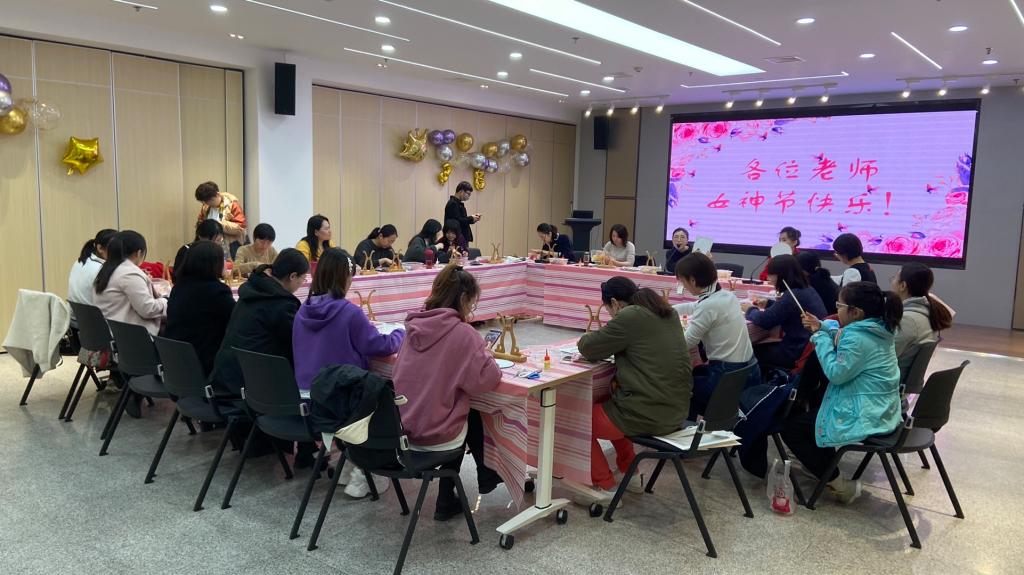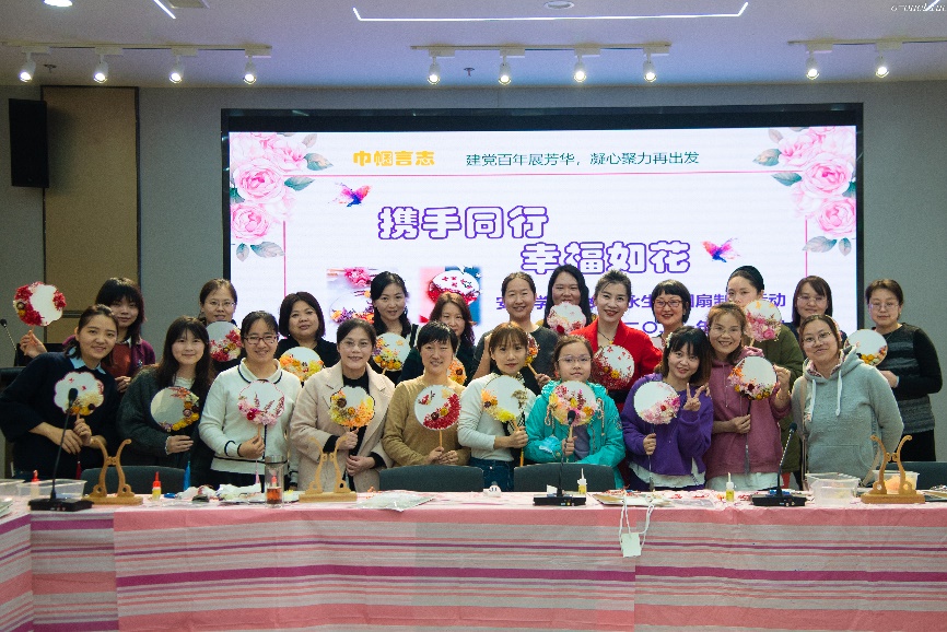 接下来,在制作老师的指导下,女教工们体验了一场制作永生花团扇的艺术之旅。每位女教工充分发挥自己的创意和想象力,妙心巧手设计团扇黏贴方案,一幅幅清新淡雅的团扇作品逐渐呈现于眼前,寄托着大家对美的理解和对幸福的感悟。大家在制作过程中互相交流经验,整个活动现场情绪热烈,气氛高涨,其乐融融,美丽的团扇与笑靥如花的女教工们交相辉映,格外美丽。